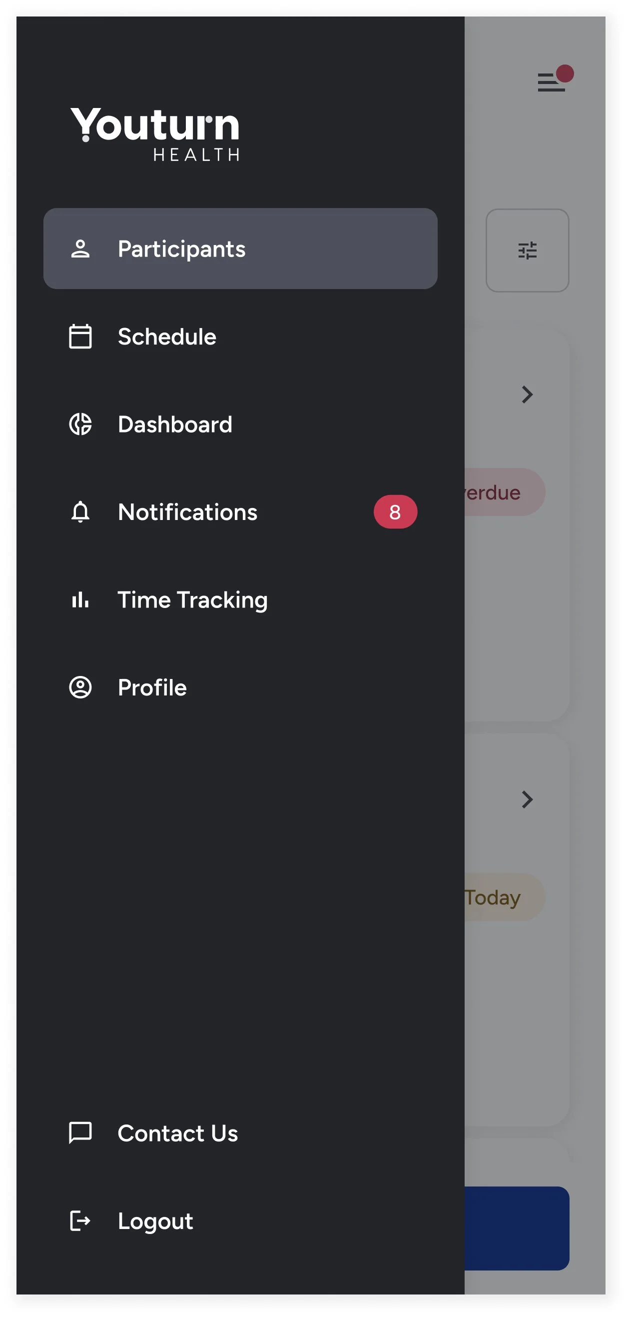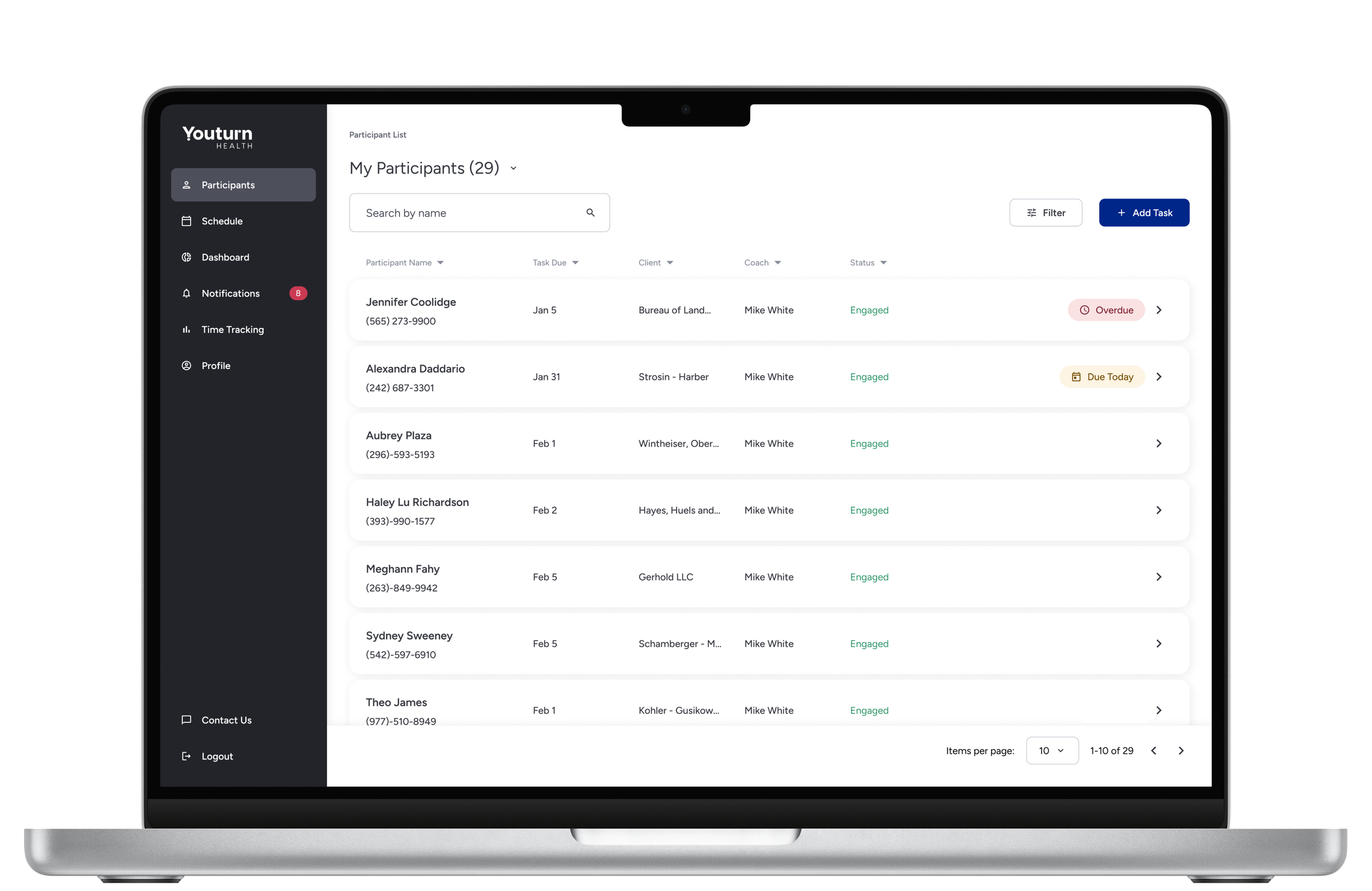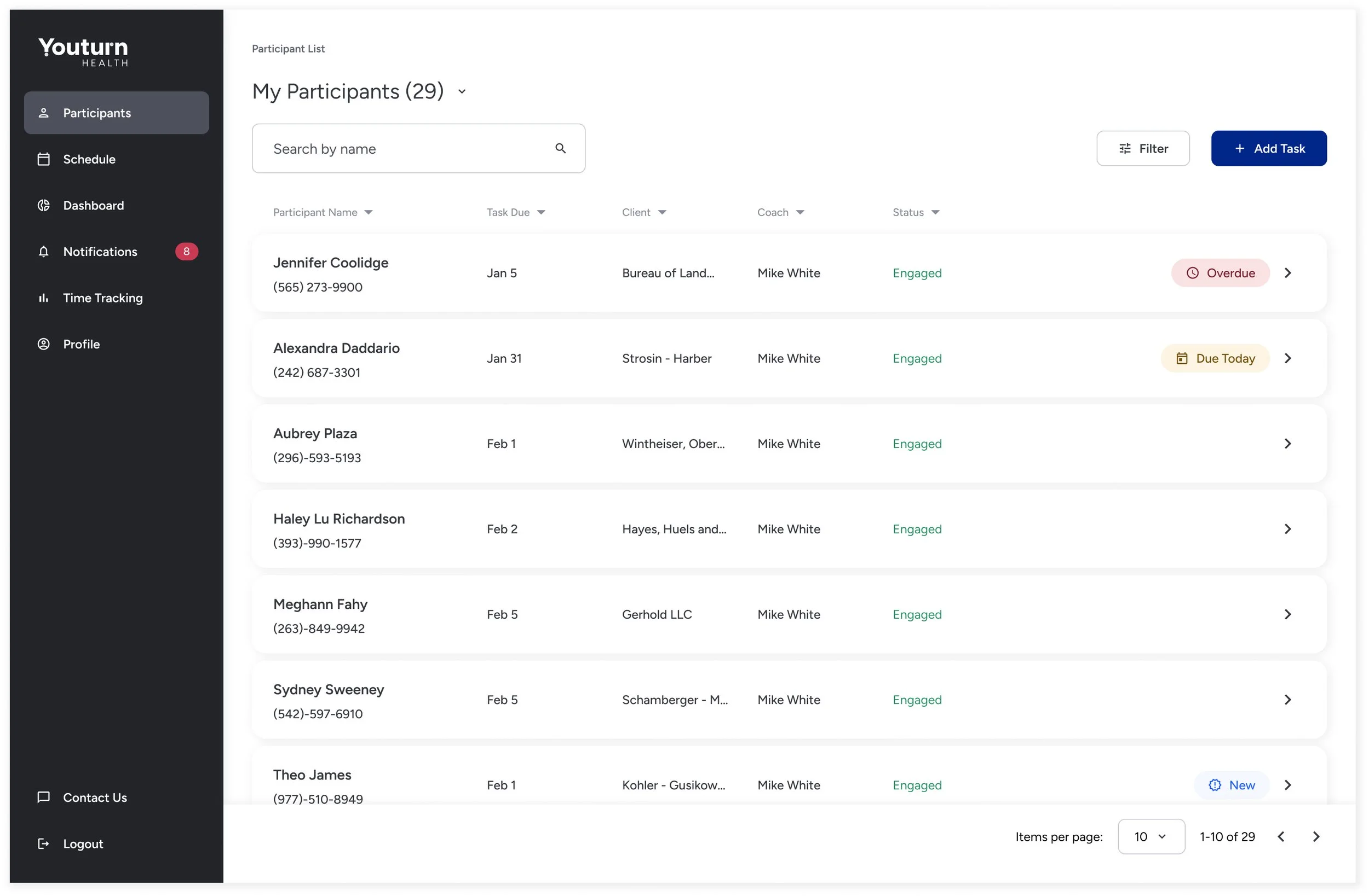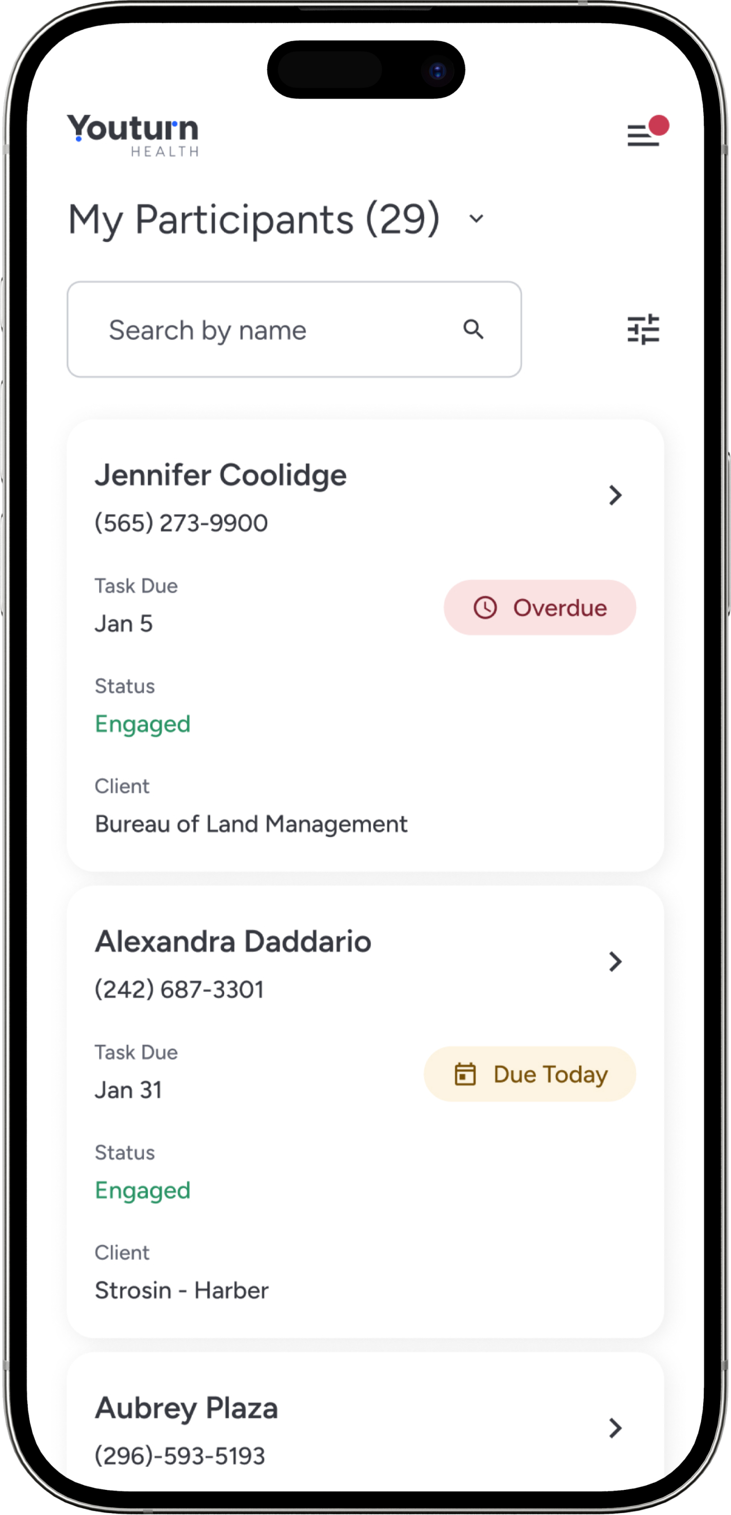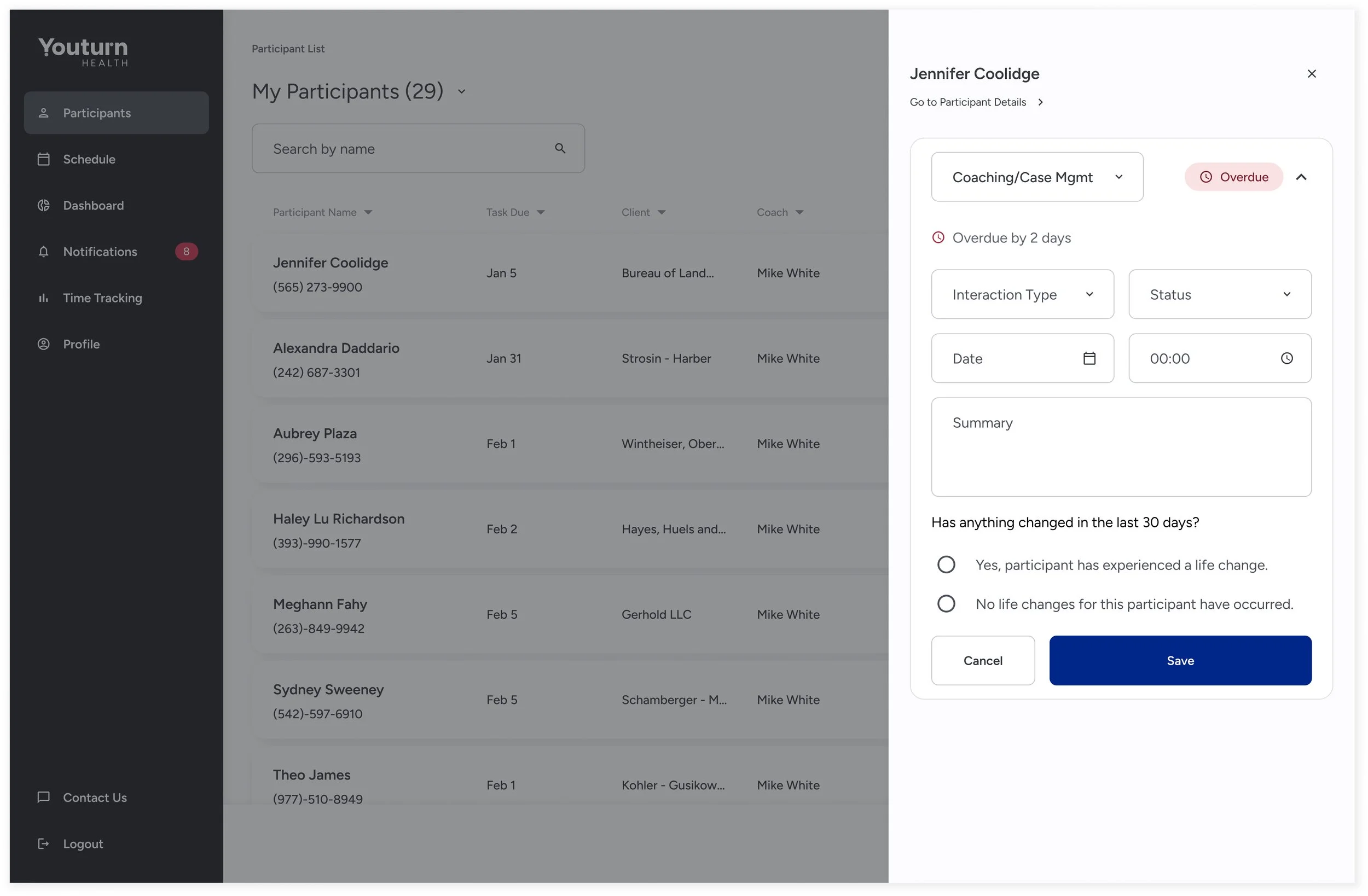 From the participant list, coaches can dive into detailed information, easily viewing concerns and notes to foster stronger connections and provide better care. They can also quickly see overdue and upcoming tasks for each participant.